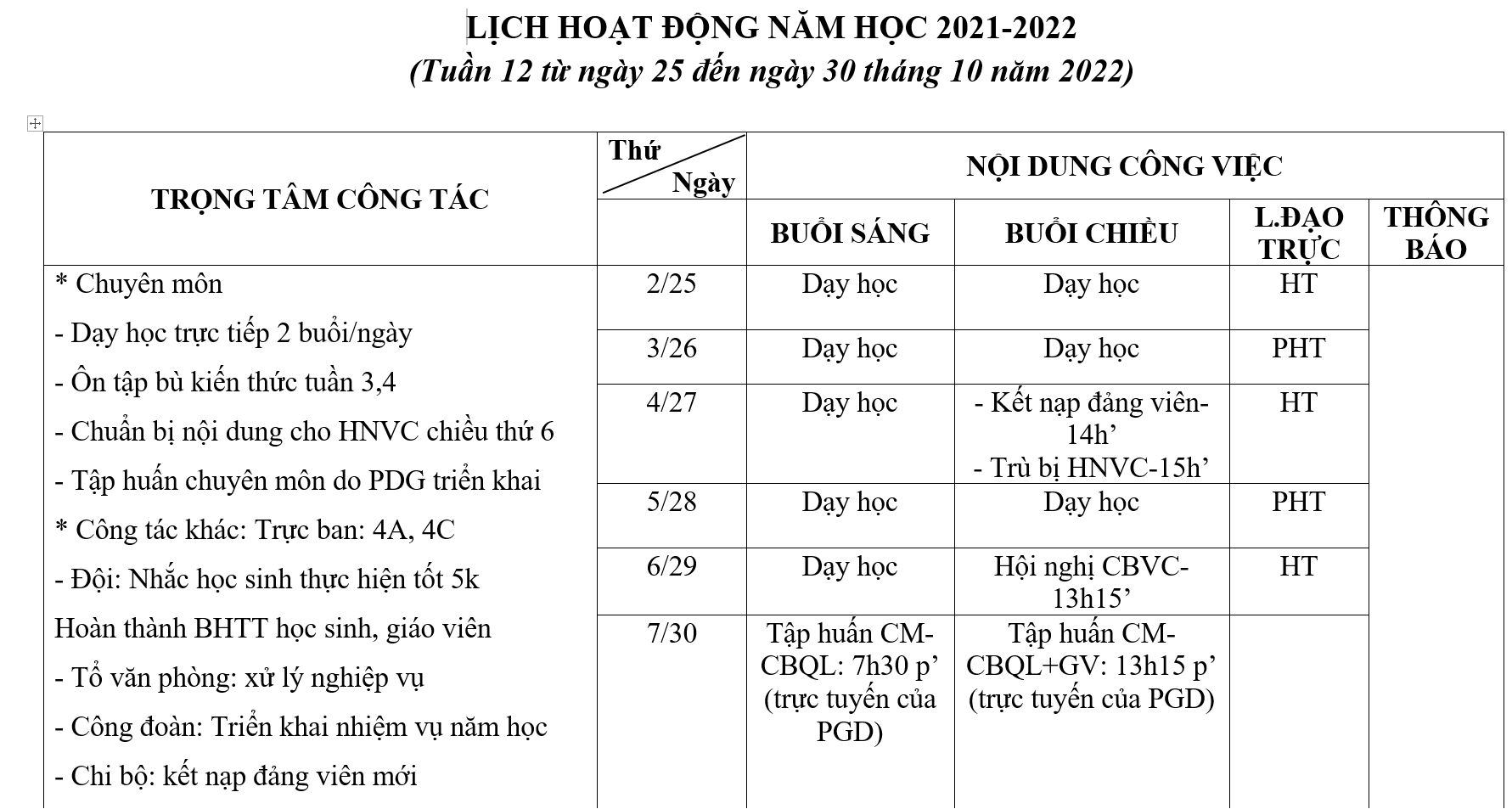 LỊCH HOẠT ĐỘNG NĂM HỌC 2021-2022 (Tuần 12 từ ngày 25 đến ngày 30 tháng 10 năm 2022)